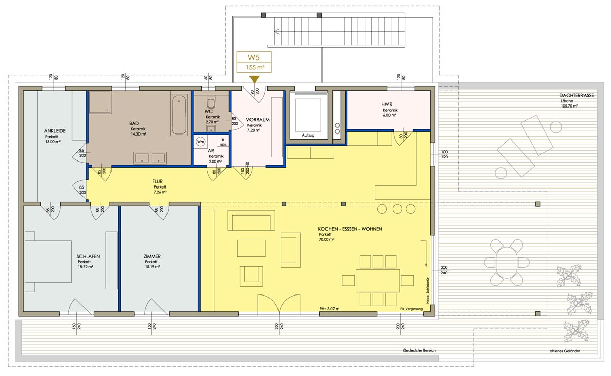 Ein Badezimmer mit 14m² und sehr hochwertigem Ausstattungsmerkmalen ist ein Must-have in diesem Luxusdomizil. Für Ihr Auto sind zwei überdachte und ins Haus integrierte Parkplätze mit direktem und überdachtem Gang zum Lift vorgesehen. Somit ist auch beim schlimmsten Regenguss gewährleistet, dass Sie trockenen Fußes in Ihre Wohnräume gelangen.