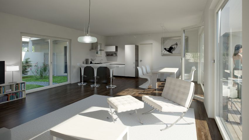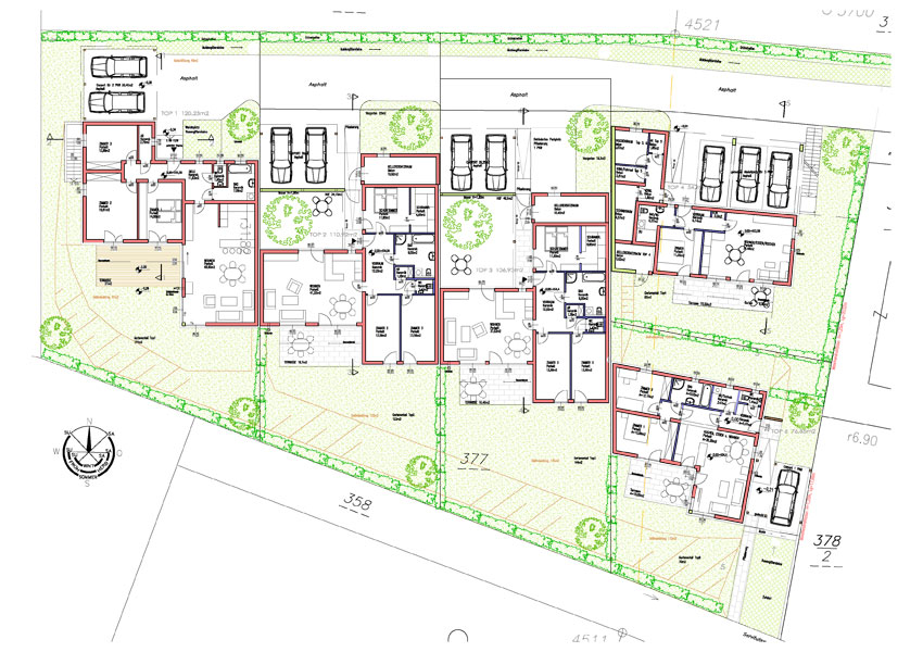 Individualität und Privatsphäre waren die Herausforderungen bei der Umsetzung dieser Planung. Trotz der kompakten und somit energetisch perfekt gelösten Architektur bleibt die Uneinsehbarkeit unter den Bewohnern gewahrt.